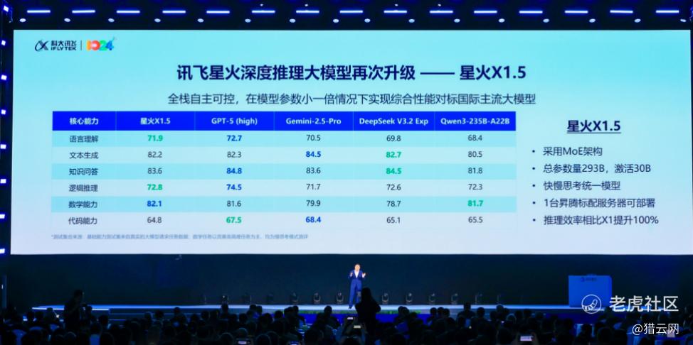 不到十个月,此次1024发布会上,科大讯飞深度推理大模型讯飞星火X1.5正式亮相:采用MoE架构,总参数量293B、激活30B,推理效率相比星火X1提升100%。它的语言理解、文本生成、知识问答、逻辑推理、数学能力、代码能力等六大核心能力全面对标国际主流,其中数学能力持续保持国际领先;其多语言能力覆盖超过130个语种,整体性能达到GPT-5的95%以上……