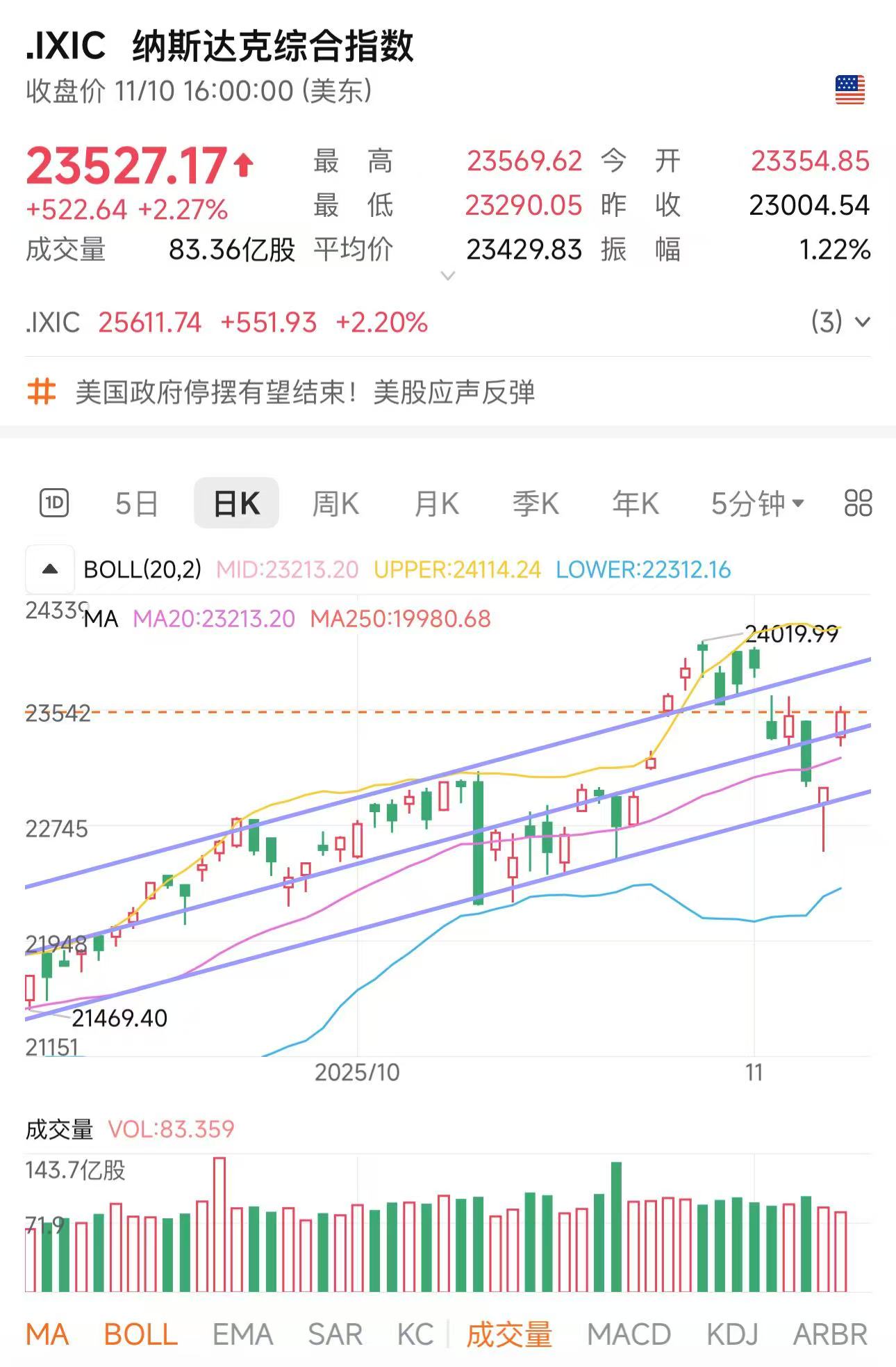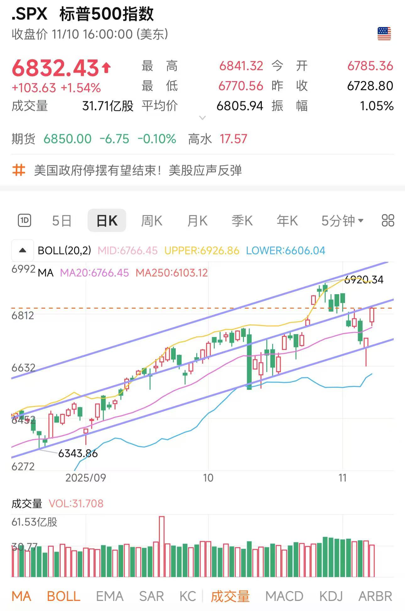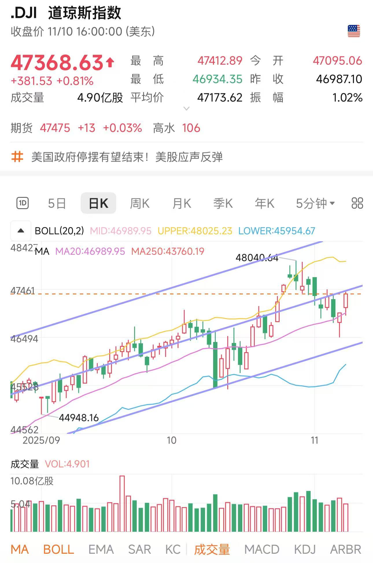 美国主要指数周一(11月10日)大幅反弹,科技股和人工智能题材领涨,推动道指收于47,368.63点,标普500收于6,832.43点,纳指收于23,527.17点。这一涨势主要源于华尔街对结束政府关门的乐观预期和AI概念股大涨。