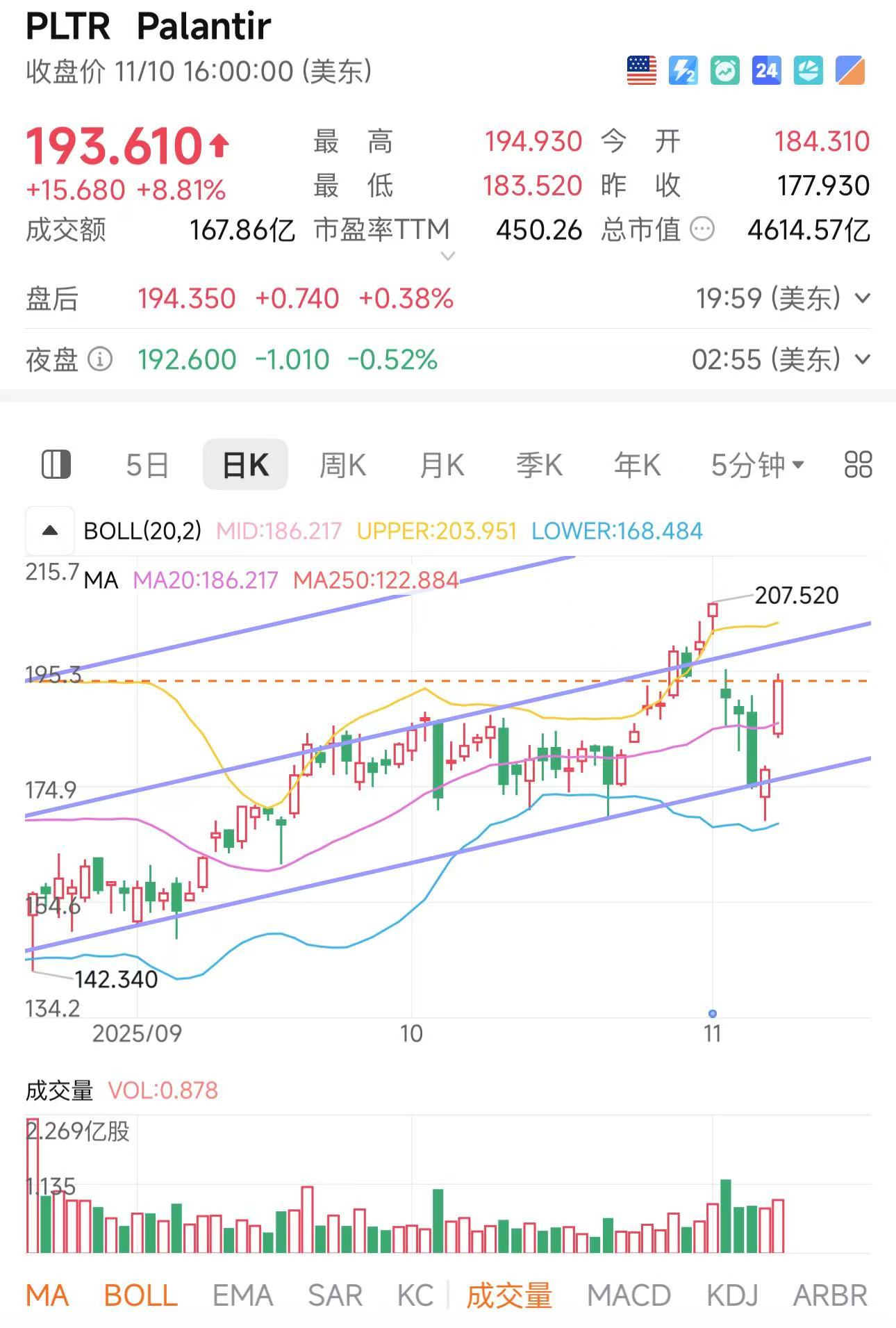 $Palantir Technologies Inc.(PLTR)$ 周一收涨8.8%,收于约$193.6。Palantir公布强劲财报并上调全年业绩预期,显示AI分析软件需求旺盛。技术上,当前股价逼近195–200美元关口,支撑位在180美元(本周初波动低点)和170美元;阻力则看200美元整数及更高。短线情绪极度乐观(年内涨幅已超100%),但估值非常高,预期市盈率超240倍。操作建议审慎跟进:若开盘冲高可择机获利,留意价格回调;若企稳支撑位则可适度参与博弈,但应防范市场情绪迅速冷却的风险。