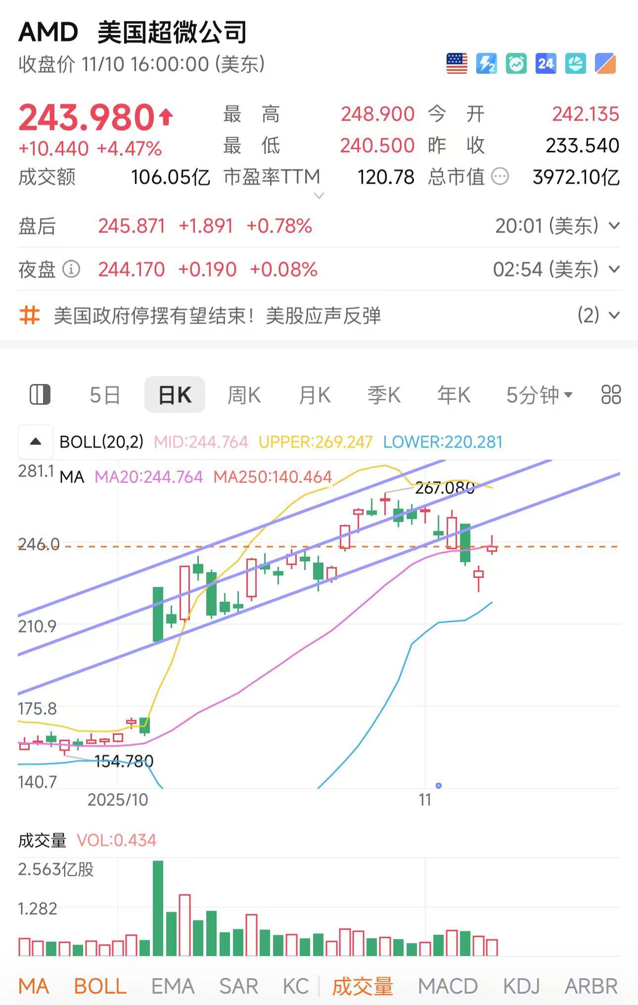 $美国超微公司(AMD)$ 周一收报$243.98,涨幅约4.5%。公司上周发布业绩预告,预计第四季度营收超过华尔街预期,受益于云计算和AI加速对芯片的需求增长。技术面,目前股价接近250美元阻力,支撑位看230美元(前期整理区低点)和220美元;如突破250美元有望挑战更高新高。资金流向显示科技股吸金势头强劲。操作上可跟随市场节奏,重点关注业绩兑现情况和美中关系变化,短线可部分获利了结。