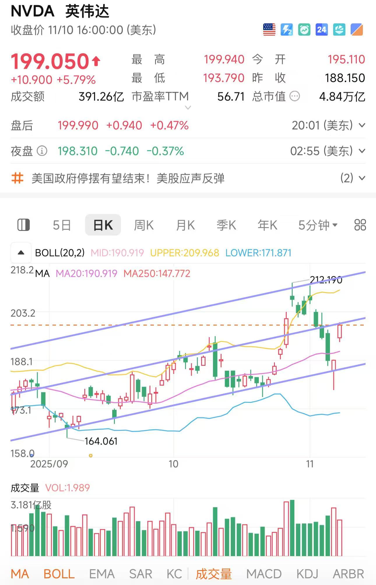 $英伟达(NVDA)$ 周一大涨5.8%,收于约$199。基本面上,英伟达公布数据中心业务订单额高达5000亿美元,引发华尔街乐观预期,高盛将目标价提升至240美元,并预计Q3业绩将再次超预期。技术面,当前股价已接近200美元整数关口,下一轮阻力可参考约210美元水平;支撑关注190美元(本周低点附近)和180美元(前期调整低点)。短线情绪偏乐观,盘前若股指继续上行,可望跟涨开盘,但需警惕获利盘。操作上可考虑低位分批买入,若站稳200美元以上关注进一步拉升空间。