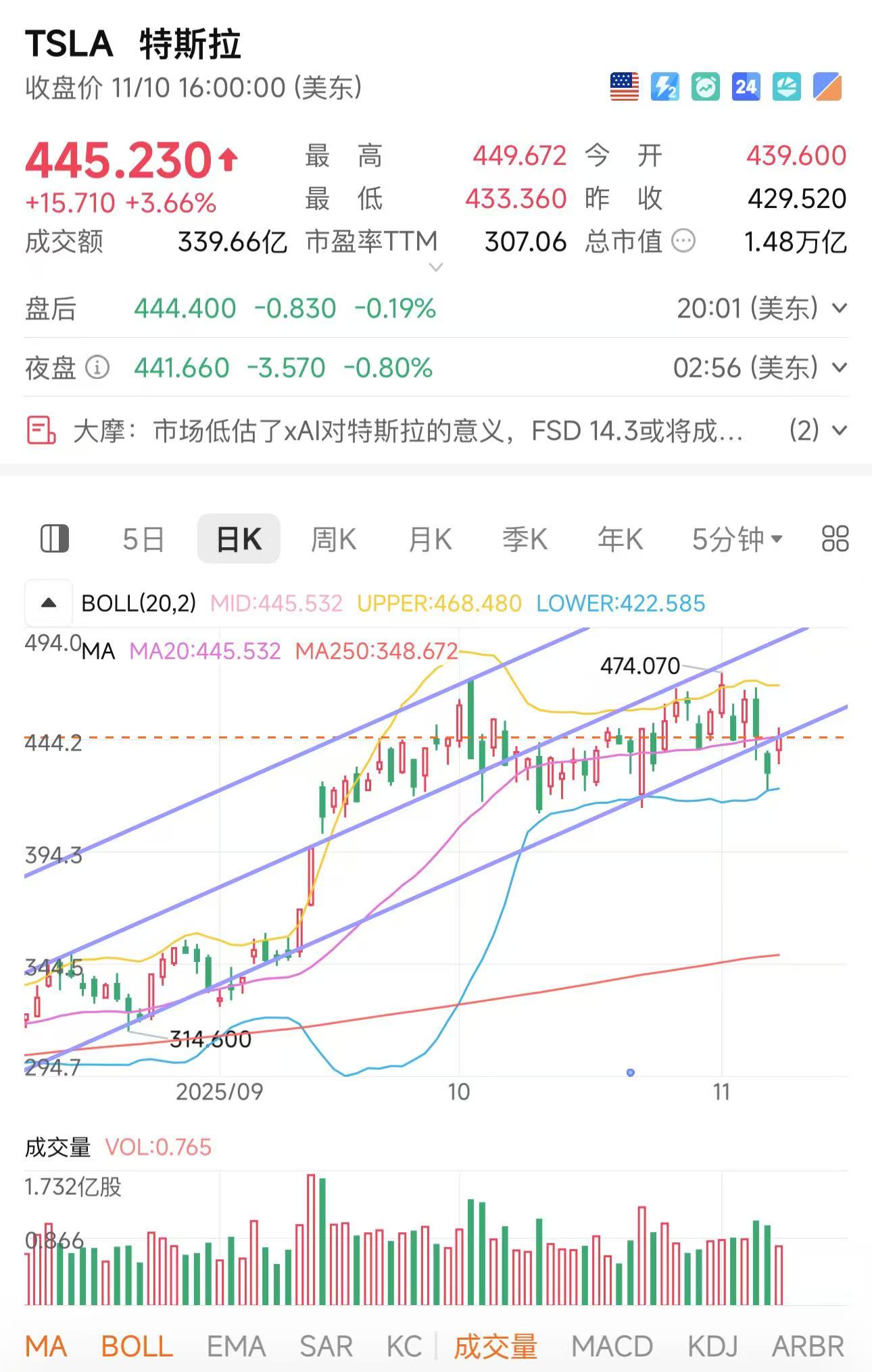 $特斯拉(TSLA)$ 周一收涨3.7%,收于约$445。近期特斯拉业绩显示,尽管成本上升和补贴减少压缩了利润率,但出货量创新高,加上下调车型售价拉动需求,市场反应积极。当前技术上,下方支撑约在430美元(前期低点)和400美元心理位;上方阻力在450美元(前期高点)及更上方。盘前看多情绪依然浓厚,但需提防成本走高和政策变动风险;短线可关注日内支撑持续性,操作上可逢低做多,若跌破430美元短期则偏谨慎。