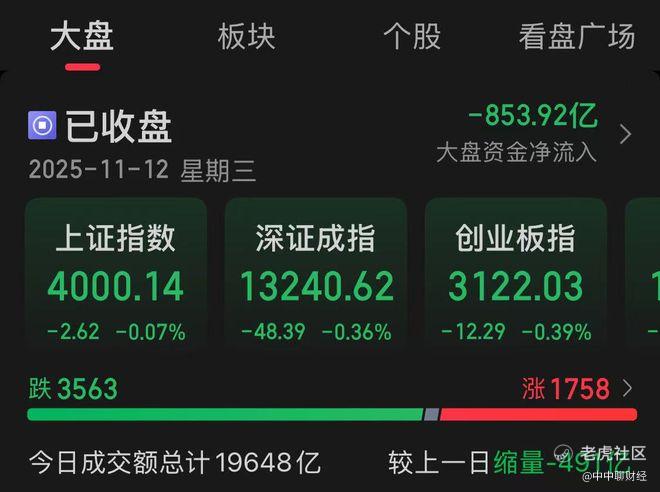 $上证指数(000001.SH)$ 11月12日,A股三大指数走势较为平稳,但是个股却是普跌的状态,上升趋势结束了吗?我们知道,大盘已经在4000点上下徘徊了一段时间了。如果一直持续不前,我们就需要警惕了。下面,我先来看一下今天的走势: