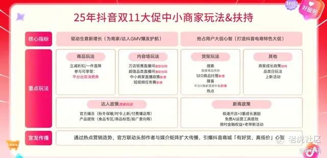 一方面是降低门槛和经营成本,免佣、降费、现金补贴、物流保障等政策投入,持续优化商家交易流程,同时针对新商家推出了“极速开店成长激励、免费AI运营工具提效、限时金融权益、老带新活动”等举措,鼓励更多中小商家在抖音起步。另一方面,此次双11抖音电商为中小商家提供了更丰富的营销玩法、全方位的资源扶持以及海量的经营攻略指导,中小商家无需担心不会玩,只要跟上平台节奏、积极参与就有机会获得各类流量和资源扶持。