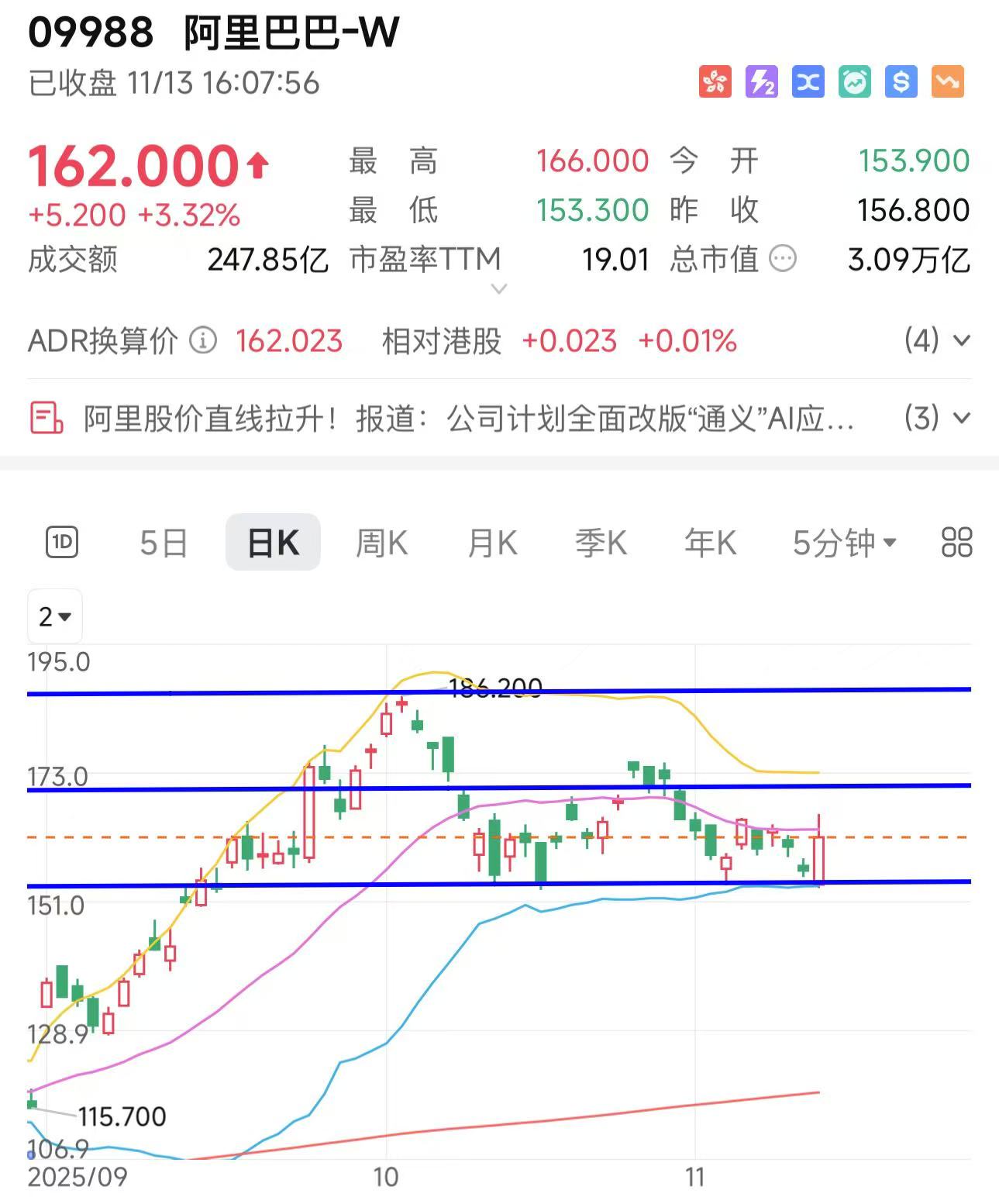 $阿里巴巴-W(09988)$ 今收162,日内低153.6,高165.7。尾盘放量向上收中阳,成交明显放大。形成带长下影的中阳线,下方有短线买盘接力,但上方仍有抛压。