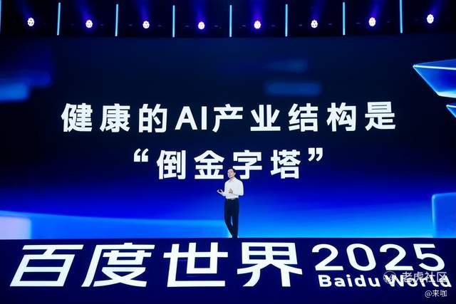 大会上,李彦宏再次强调AI应用创新的价值。他表示AI产业结构正从不健康的“正金字塔”转变为“倒金字塔”。在“倒金字塔”中,模型产生10倍于芯片的价值,AI应用能创造100倍价值,从而形成健康的AI产业结构。