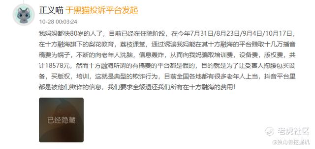 由于学员年龄大,许多学员是由孩子发现后来替父母维权。10月28日,一位80岁的学员的孩子投诉,十方融海旗下的梨花教育、荔枝课堂,通过能赚取高额播音稿费为幌子,不断向老年人洗脑、信息轰炸,从而“骗取”培训费、设备费、版权费,一共18578元。