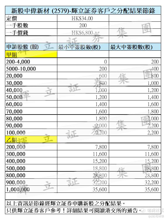 中伟新材(2579)出分配结果了,25手稳1手,甲尾11手,乙头是39手,中签率很高,估计很多人都没有申购;定价:34.00,下限定价,良心了,一手200股;恭喜中签的老板们!这肯定是有肉喝的,较A股折价大概有39%,预测涨幅大概是10%,具体分析可以看看上一篇文章,只做参考,不做投资买卖建议。