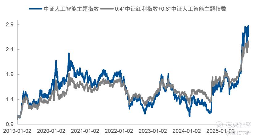 下图是中证人工智能主题指数和40%中证红利指数+60%中证人工智能主题指数的对比,指数的涨跌基本趋同,收益差距不大。