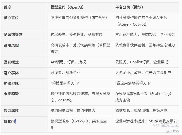 中长期(3-5年),平台公司(微软)更可能建立护城河,因为企业级AI落地需要,多模型组合(专用模型+通用模型),数据安全、隐私、合规,与现有IT系统无缝集成。这就像 云计算时代,AWS起步靠技术领先,但最终Azure、GCP赢在生态和企业服务。