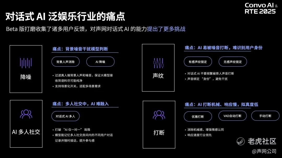 面对这样的竞争格局,杨帆将目光聚焦到“AI+社交”的新方向。他回顾了声网自 2023 年起在 AI 社交领域的探索过程,从早期从破冰提示试水,只能做 1v1,到去年正式推出集成 AI 降噪、超低延迟、优雅打断等能力的对话式 AI 引擎 1.0 版本,致力于解决多人通话延迟高、街头聚会等高噪音场合使用体验差等问题。