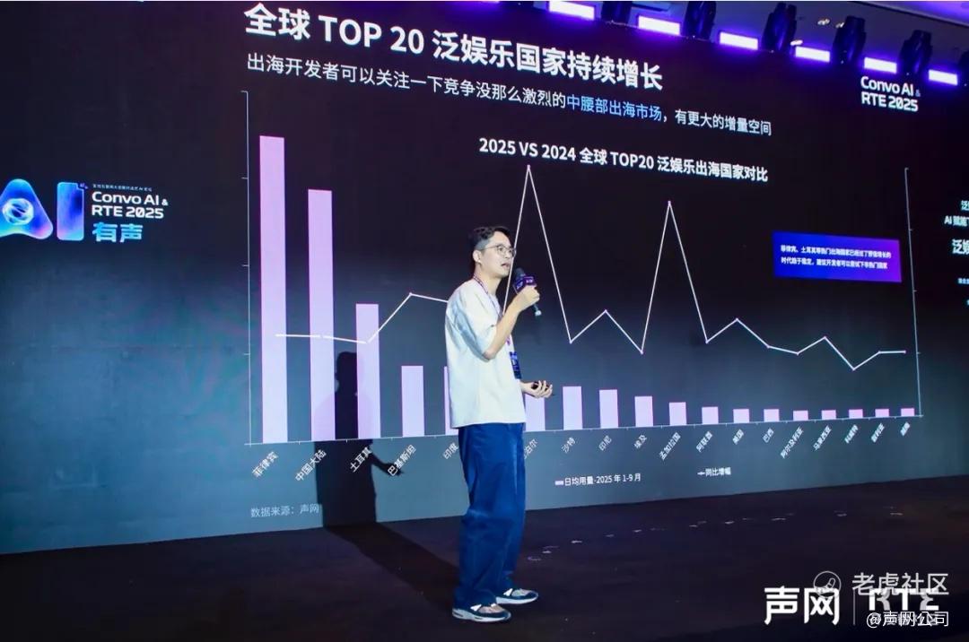 声网泛娱乐产品负责人杨帆围绕“AI 定义的社交娱乐和出海新形态”进行了深度分享,从区域趋势到 AI 技术落地,他结合最新数据与一线观察,系统阐述了当前泛娱乐产品出海的挑战与突破口。