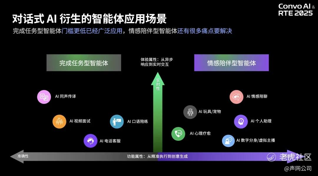他还进一步拆解了对话类 AI 产品的两大核心路径:一是“效率型 AI”,比如破冰助理、客服、语言陪练等,这类技术更偏工具性、任务导向;二是“情感型 AI”,更注重语音情绪识别、多模态交互等复杂体验。他指出,目前完成任务型的 AI 已相对成熟,而情感陪伴型 AI 还面临情绪识别弱、长期记忆差等难题,仍需模型精进。