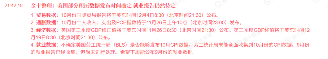 美元指数也跌至99的关口。尽管分析人士认为是美联储鹰派表态导致美股黄金承压,但疲软的美元指数和美债收益率否认了这一看法。市场担忧美国流动性紧缩以及经济衰退,故美元指数并未受益于鹰派联储发言。美国劳工部和商务部经济分析局都指出,部分数据可能永久性的失去,包括10月失业率与CPI等。据财经网站,部分经济数据日程如下: