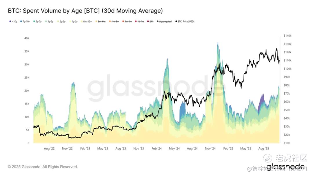 图3:按持币时长划分的链上转出量(BTC,30日移动均值),图片来源:glassnode