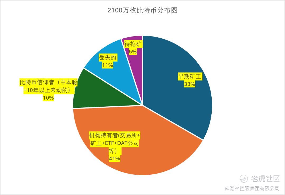 我们按照相对保守的合理估计——230万枚计算。加上中本聪持有的110万枚,10年以上未动过的巨头94万枚,待挖掘的105万枚,机构投资者持有的896万枚,我们画出了整个比特币的分布图。