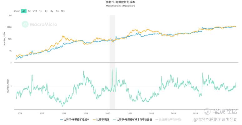当比特币价格大于生产成本、矿工有利可图,则可能增加挖矿设备,或者会有更多新矿工加入,导致挖矿难度增加、生产成本提高,推动价格进一步提升; 反之,当比特币价格低于生产成本,新增矿工减少,挖矿难度停止上升,市场静待需求回暖。2023年以后,随着算力的增加和机构主导市场,比特币价格与生产成本日趋一致,波动显著降低。