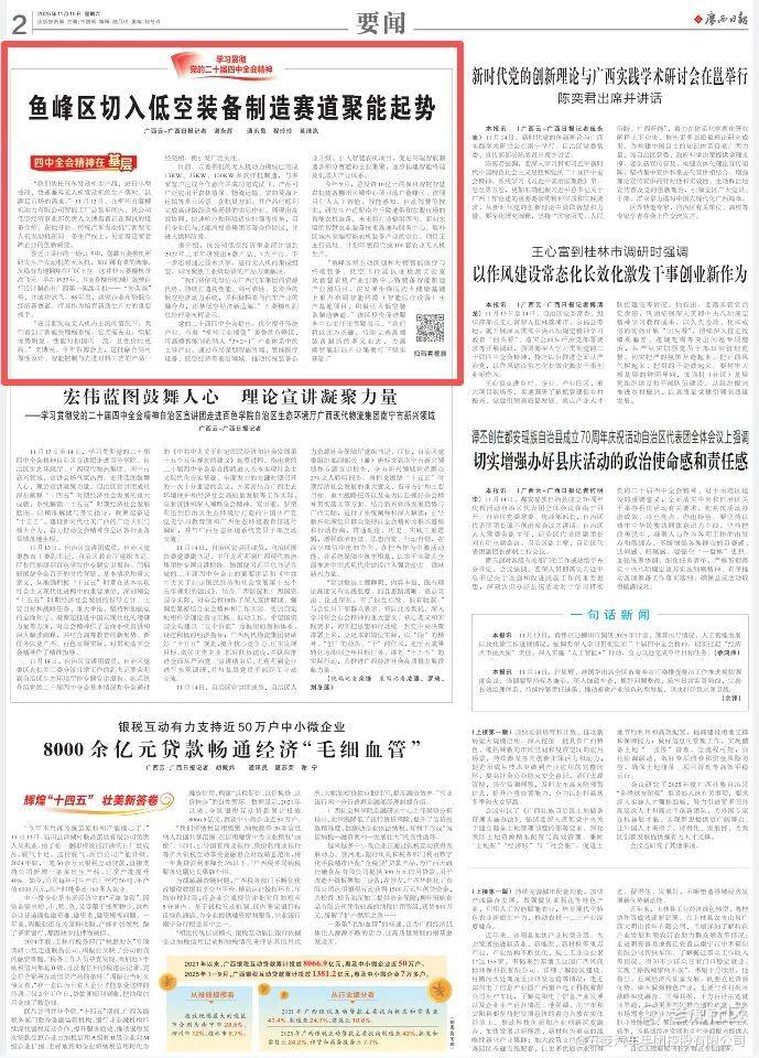 深入学习贯彻党的二十届四中全会精神: 2025年11月15日,广西日报第2版要闻刊发栏目稿件,报道广西柳州市鱼峰区,特别是聚焦五菱汽车所属五菱柳机学习贯彻党的二十届四中全会精神,切入低空装备制造赛道聚能起势,推进高端智能制造产业发展的相关亮点。