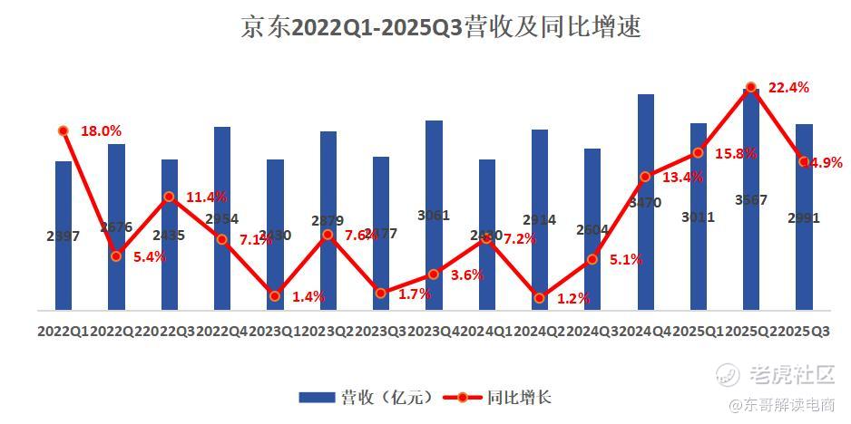 11月14日,京东集团发布了业绩公告。财报显示,京东Q3总营收2991亿元,同比增长14.9%;超过市场预期的13%,归属于普通股股东的净利润为53亿元,同比减少54.7%。