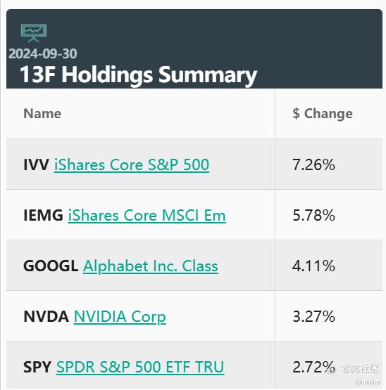 看起来,桥水的持仓较为分散,前十大持仓标的,只是他们总持仓市值的32.29%。他们的前五大持仓标的分别是iShares核心标普500ETF(IVV)与iShares核心MSCI新兴市场ETF(IEMG)、谷歌A、英伟达和SPDR标普500ETF信托(SPY)。除了伟大的谷歌,其他的都是ETF,针对这个持仓,如果可以发问一下,我想问一下谷歌,您觉得荣幸吗?[贱笑]