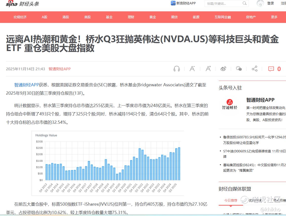 1. 他们做了一个投资组合调整,桥水在2025年Q3的13F报告显示,继续加码科技股和软件类公司,例如 $Adobe(ADBE)$ , $谷歌(GOOG)$ ,NVIDIA,并保持对消费类ETF(例如SPY,IVV)的高配。新增或增持了Sea Ltd(东南亚电商)、Reddit等互联网平台,显示其对新兴市场和社交媒体的兴趣。减持了一些传统行业股票,但仍保留部分金融和工业类资产,保持组合的多元化。