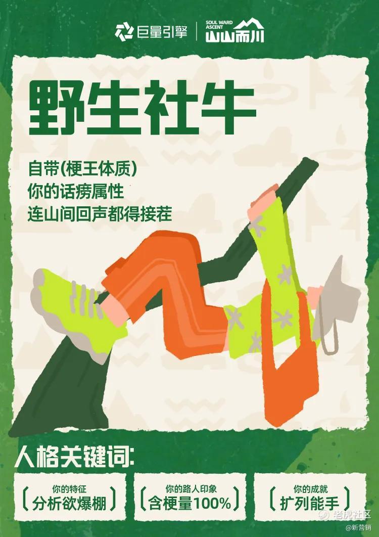 与此同时,活动主会场内,平台联合品牌在抖音站内首发五大“山人MBTI”——荒野硬核玩家、户外成就收藏家、山野疗愈艺术家、野生社牛、自然生命力E人,用当下最流行的社交标签为户外人群制造身份认同,引导核心圈层“对号入座”。用户可以认领自己的户外人格并一键分享寻找同频山人,这种玩法既降低参与门槛,又能激活社交传播,形成用户主动扩散、圈层自发活跃的态势,也能帮助品牌精准识别出兴趣人群。