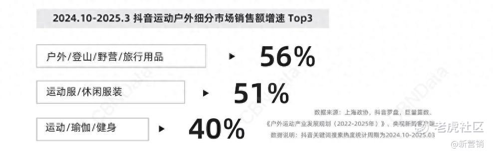 就这样,以抖音为代表的社交媒体,不仅借助强大的内容生态促进户外运动破圈,也助力了相关品牌的生意增长,整体上推动了户外运动产业的发展进步。因此,在抖音寻找生意增量机会成为许多户外运动品牌顺理成章的选择。