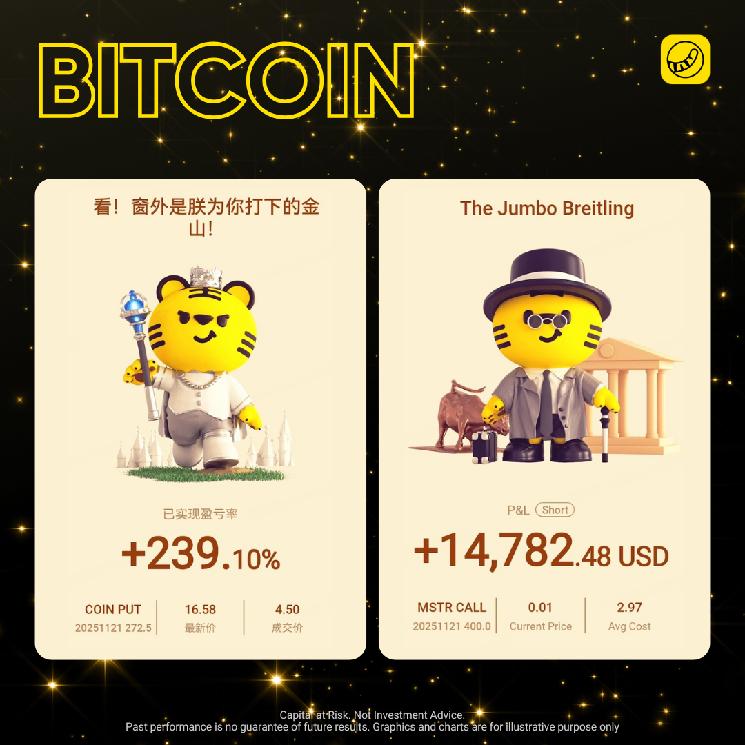 过去两周,加密市场突然“变脸”。比特币失守 10 万美元心理关口,随后又跌破多个关键技术位,从高点回落超过 27%,连带 COIN、MSTR 等加密概念股也出现明显回调。就在大部分投资者还在犹豫、观望、甚至抄底时,有虎友已经靠期权精准吃到这一轮调整带来的利润,这篇文章就带大家复盘一下虎友的“发财瞬间”。