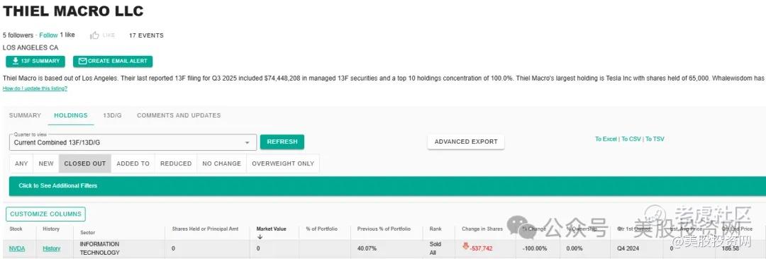 “白宫背后的科技大佬”Peter Thiel旗下的投资工具Thiel Macro LLC,三季度清仓了高达40%的英伟达持仓