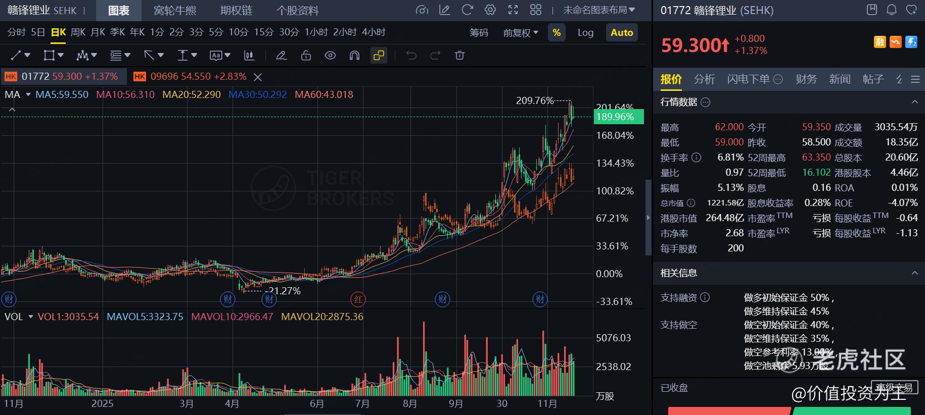 乐观预期带动下,赣锋锂业和天齐锂业股价不断上涨,在港A市场回调时,成为耀眼的明星: $赣锋锂业(01772)$ $天齐锂业(09696)$