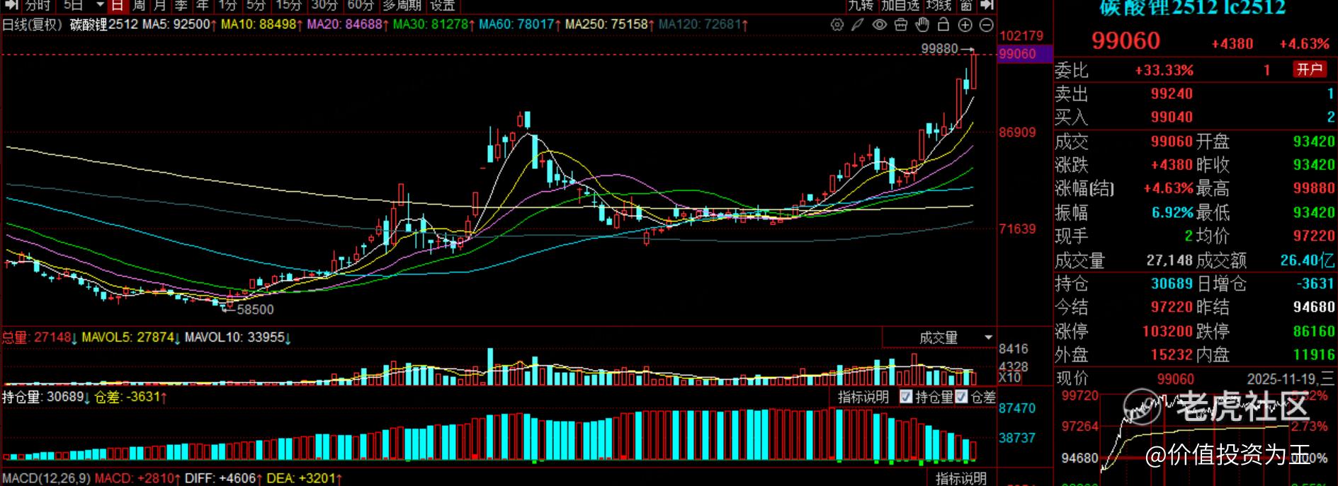 与此同时,碳酸锂期货价格也开始飙升,逼近10万大关: