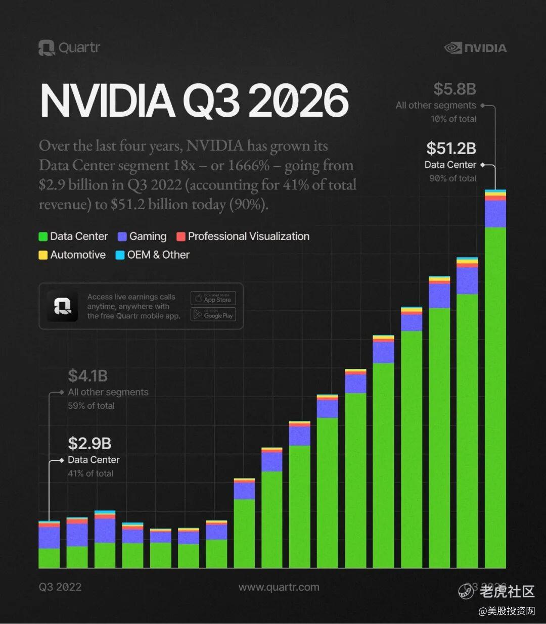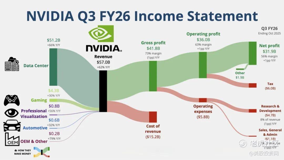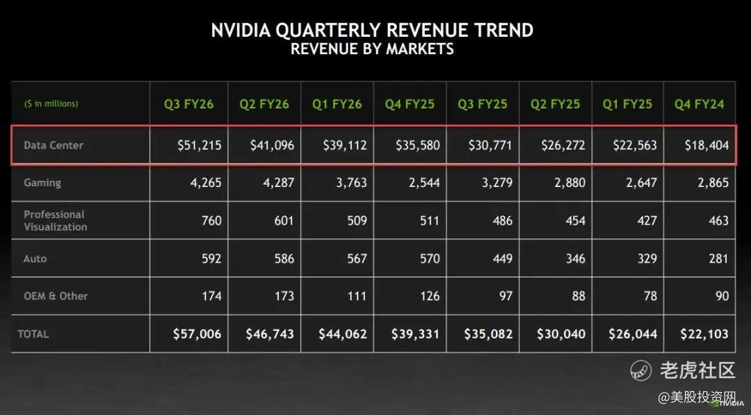 贡献三季度将近九成营收的数据中心业务收入:510 亿美元——注意,一年前这个数字才300亿。这不是增长,这是黄仁勋直接把Excel里的数值调成了“指数型增长曲线”。它的同比增速也从上季度的56%提高到了66%。