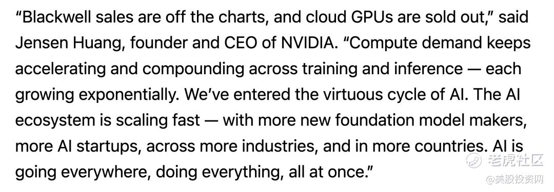 需求无上限: 他直言,公司新一代Blackwell架构芯片“销量远超预期,云端GPU已售罄”。他已经不再用“强劲”来形容AI需求,而是用“训练和推理的计算需求持续加速增长,均呈指数级增长”,声称“我们已进入AI的良性循环。”