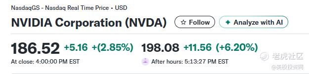 财报一出,英伟达收盘时本来就涨了近3%的股价,在盘后涨幅曾超过6%。