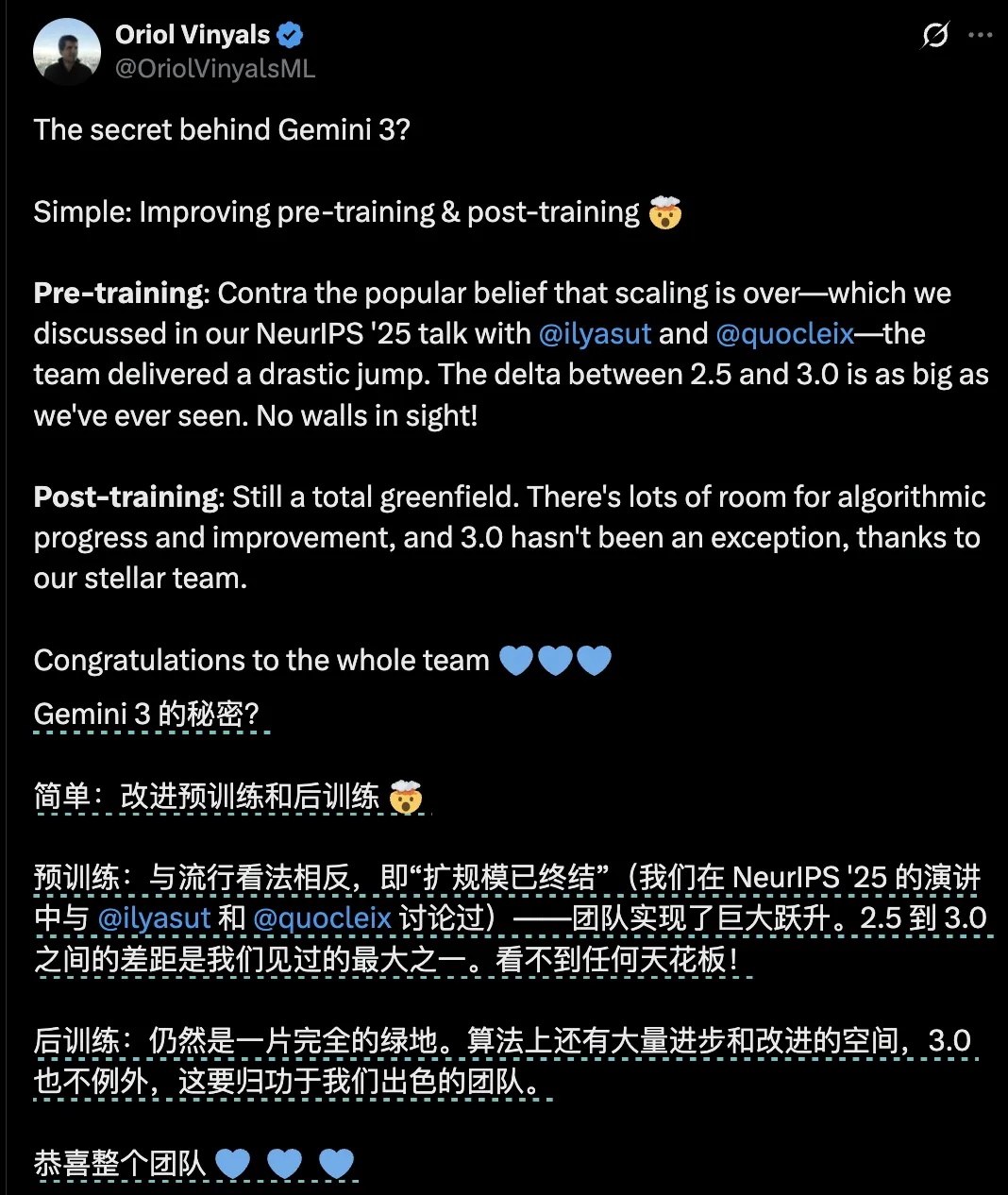 Oriol Vinyals,Google DeepMind的VP of Research、Deep Learning Lead和Gemini项目的联合负责人,在Gemini 3发布后发推文说:“Gemini 3的秘密?简单:改进预训练和后训练。后训练仍然是一片完全的绿地。算法上还有大量进步和改进的空间”。他特别强调:“与流行看法相反,即‘扩规模已终结’——团队实现了巨大跃升。2.5到3.0之间的差距是我们见过的最大之一。看不到任何天花板!”