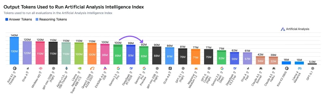 另外,Gemini 3还开启了一个新的性能-成本比逻辑。在API上,Gemini 3 Pro的定价并不亲民,每百万输入/输出Token的价格高达$2/$12,是目前运行成本最高的模型之一。但考虑到它在token效率上却相对更高,比起其他如Kimi K2的模型,它在相同任务上用的tokens更少。这使得其实际使用成本的增加只有12%左右。