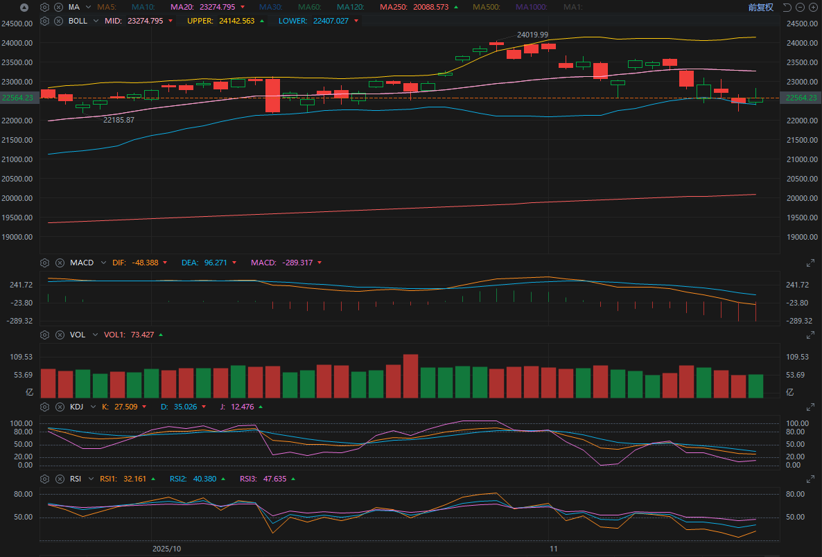$纳斯达克综合指数 (.IXIC.US)$ 当日收于约22,564,短期阻力在50日均线附近(约22,878)及心理关口23,000。短期支撑在22,400–22,450区间,下方100日均线约22,021为更为关键的中期防守位。