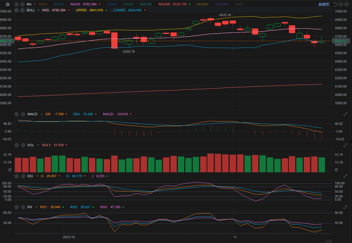 $标普500指数 (.SPX.US)$ 当前位于6,642附近,短期关键阻力在6,700一带,50日均线约在6,712左右,为短中期多空争夺的分水岭。短期支撑位集中在6,627附近,更下方中长期支撑在100日均线约6,541及200日均线约6,158。若能有效站稳并保持在50日均线之上,短期多头动能才有望确认。反之,若被50日均线持续压制,回撤至100日均线或更低的风险增加。