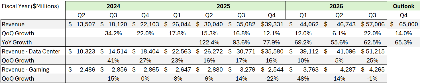 最关键的还是数据中心业务。上季大家还在担心 QoQ 增速只有 5%,是不是需求见顶了,这季直接用 512 亿美元、同比 +62.5%、环比 +25% 的成绩把所有担忧按回去。管理层还强调了 Blackwell 架构需求“off the charts”,云端 GPU 继续供不应求。也就是说,现在不是卖不动,是产能根本拉不够。Gross margin 也很漂亮,GAAP 毛利率从 72.4% 升到 73.4%,高毛利 + 高需求,说明英伟达不仅能卖得贵,还能卖得快。