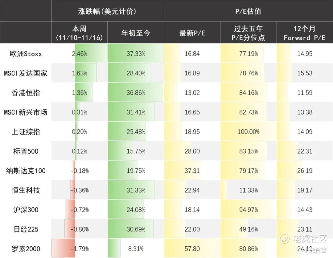 上周,美股经历了一波先涨后跌再反弹的过山车行情,兜兜转转标普和纳指最终又回到了起点,单周涨幅都几乎为0。总的来说,美国目前仍处于增长放缓,但盈利韧性较强的后周期阶段。根据FactSet的统计显示,目前超90%的标普成分股已披露Q3业绩,其中约82%的公司EPS超预期,约76%的收入超预期。不仅如此,其预估标普500 Q3的综合净利率将达到13.1%,大超前值与均值,将录得近15年来的最高水平。
