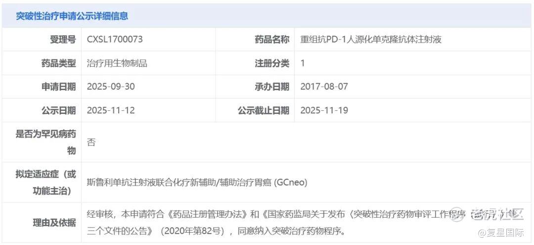 2025年11月20日,复宏汉霖宣布,创新型PD-1抑制剂H药 汉斯状®(斯鲁利单抗,欧洲商品名:Hetronifly®)被国家药品监督管理局(NMPA)药品审评中心(CDE)正式纳入突破性治疗品种名单,联合化疗用于新辅助/辅助治疗胃癌,成为首个获CDE突破性疗法认定的胃癌围手术期治疗药物。此前,H药针对该适应症的III期临床研究达到了主要终点,作为全球首个胃癌围手术期以免疫单药取代术后辅助化疗的治疗方案,有望为患者带来生存获益与生活质量提升的双重突破。