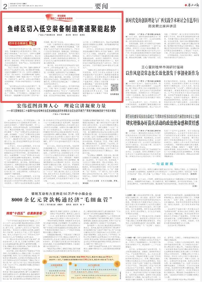 2025年11月15日,广西日报第2版要闻刊发栏目稿件,报道广西柳州市鱼峰区,特别是聚焦五菱汽车所属五菱柳机学习贯彻党的二十届四中全会精神,切入低空装备制造赛道聚能起势,推进高端智能制造产业发展的相关亮点。