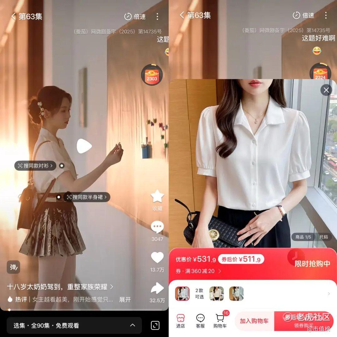 以《十八岁太奶奶驾到,重整家庭荣耀》为例,观看短剧时会出现“搜同款衬衫”、“搜同款半身裙”等提示,点击即可跳转到商品页面完成购买,无需任何跳转操作,在红果站内完成闭环交易。有媒体报道,《好一个乖乖女》《家里家外》等剧通过服饰、首饰带货,单剧GMV超500万元。
