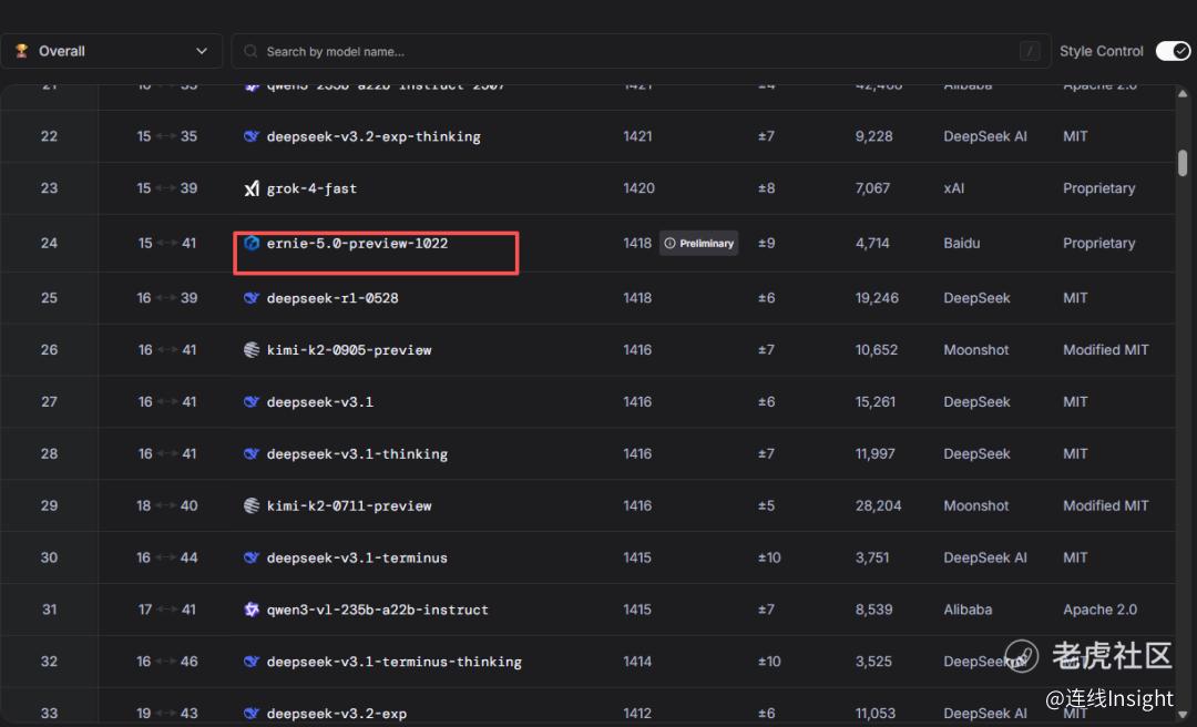 但在2025年11月21日的LMArena排行榜中,百度的文心一言5.0就排到了第24的位置。同时,其也不再是国内第一,阿里旗下的qwen3-max-preview、DeepSeek旗下的deepseek-v3.2-exp-thinking等大模型均排在其前面。