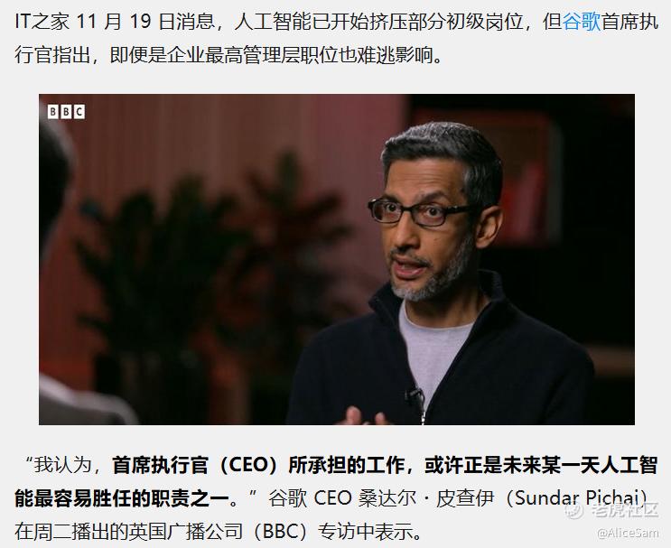 相信很多朋友都看了谷歌掌门人Pichai的采访,也都听到了他说的“无论您未来志在成为教师还是医生,这些职业本身不会消失,但各领域中脱颖而出的佼佼者,必将是那些善于驾驭并深度整合这些 AI 工具的人。” 我也看了这个采访,我也相信他的说法,特别是他说的,他相信人工智能将很快具备更高级别的自主任务执行能力,届时,AI 模型将能像“智能体”(agent)一样代表用户行事。其实,这应该是已经基本上定局的事情了,一家大厂裁员,可以说说是那家的问题,现在几乎所有的大厂都在大张旗鼓或者悄咪咪的裁员,难道大家还不明白这是大势所趋吗?越来越多的职位可以被替代,已经是事实。