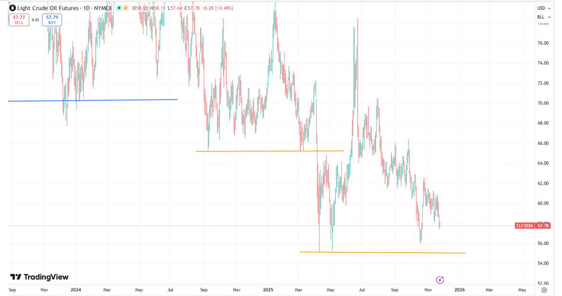 没有了避险参考,但是情绪标的物原油的价值目前还是存在的。密切留意下方55附近的关键性支撑,一旦确认跌破的话会宣布油价的价格中枢区间会再下一层,同时也暗示风险资产会面临更加严峻的抛盘压力。上周我们已经见到美股指和英伟达在周线级别上的转弱(P.S现在多空趋于均衡,而非已经牛转熊),顺着这个节奏继续指数/个股调整5-10%都是非常有可能的。