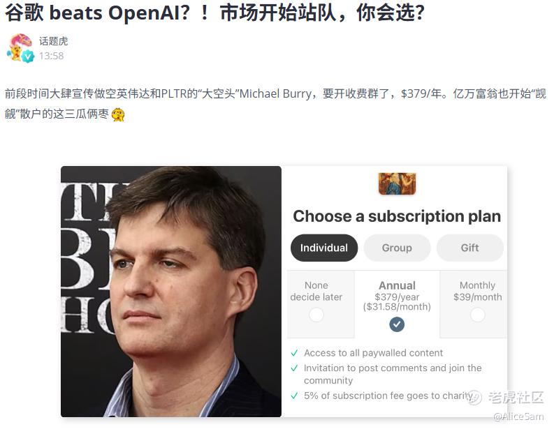 我看到的,我只能说我看到的啊,范围很窄的,很多稍微有点名气的博主,会员都是几千几百的,我想说,钱多的人,真多。这不,刚刚话题虎老师的帖子说,前段时间大肆宣传做空 $英伟达(NVDA)$ 和 $Palantir Technologies Inc.(PLTR)$ 的“大空头”Michael Burry,也开收费群了,$379/年。亿万富翁也开始“觊觎”散户的这三瓜俩枣了 [捂脸]