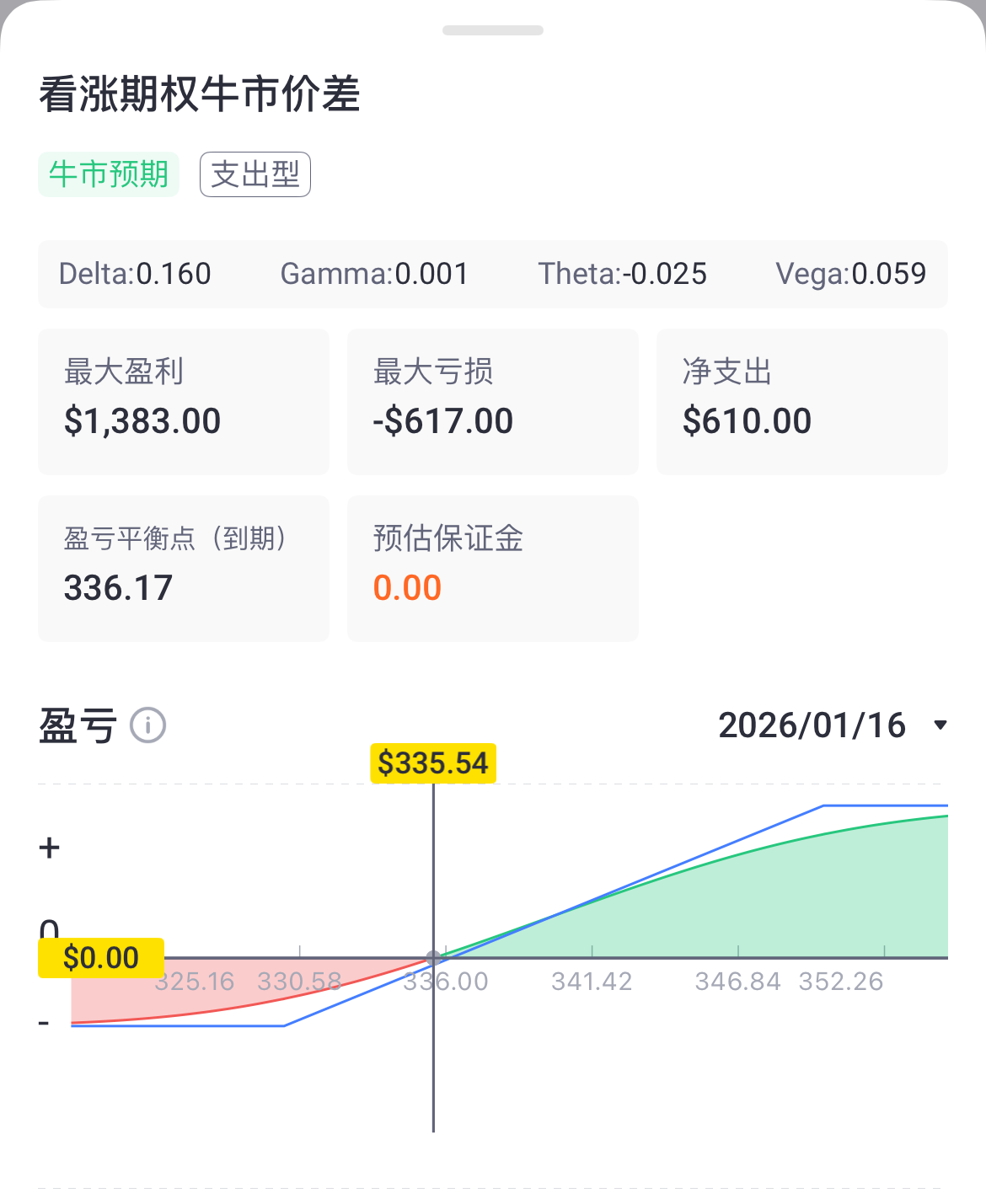 适用情景:看好谷歌股票上涨势能,又想节省权利金支出,预期谷歌股价到2026年1月16日前能涨到336.17美元-350美元期间