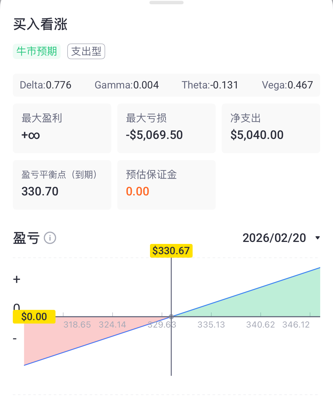 适用情境:强烈看涨,押注AI商业化带动谷歌估值重构,预期2026年2月20日前谷歌股价可以涨至 330.7美元以上(较现价有3%的上涨空间)