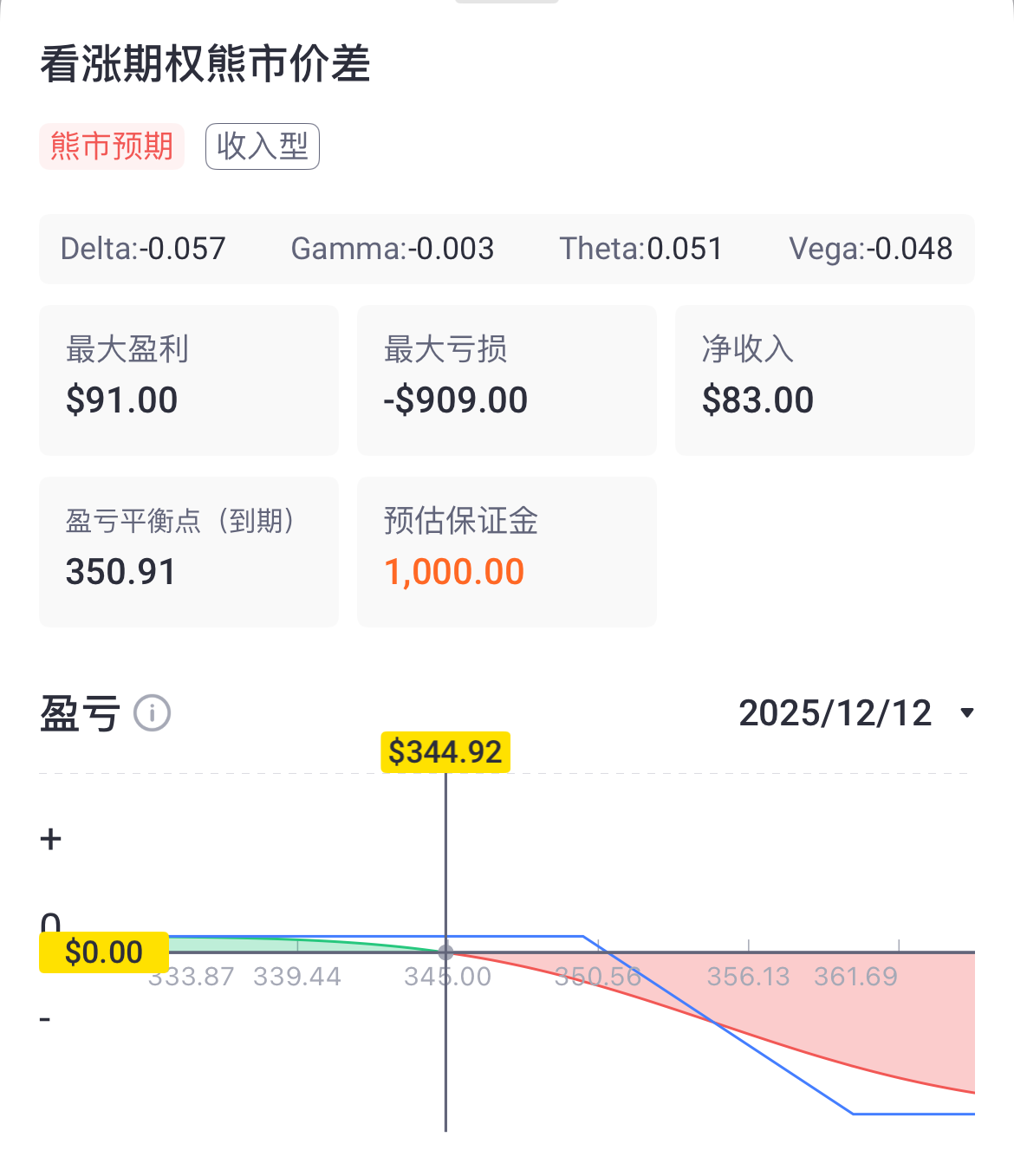 适用情境:预计股价到期前难以突破350美元(当前318.58美元,有9.86%的上涨空间),通过收取权利金获利,同时用360 Call限制上行风险